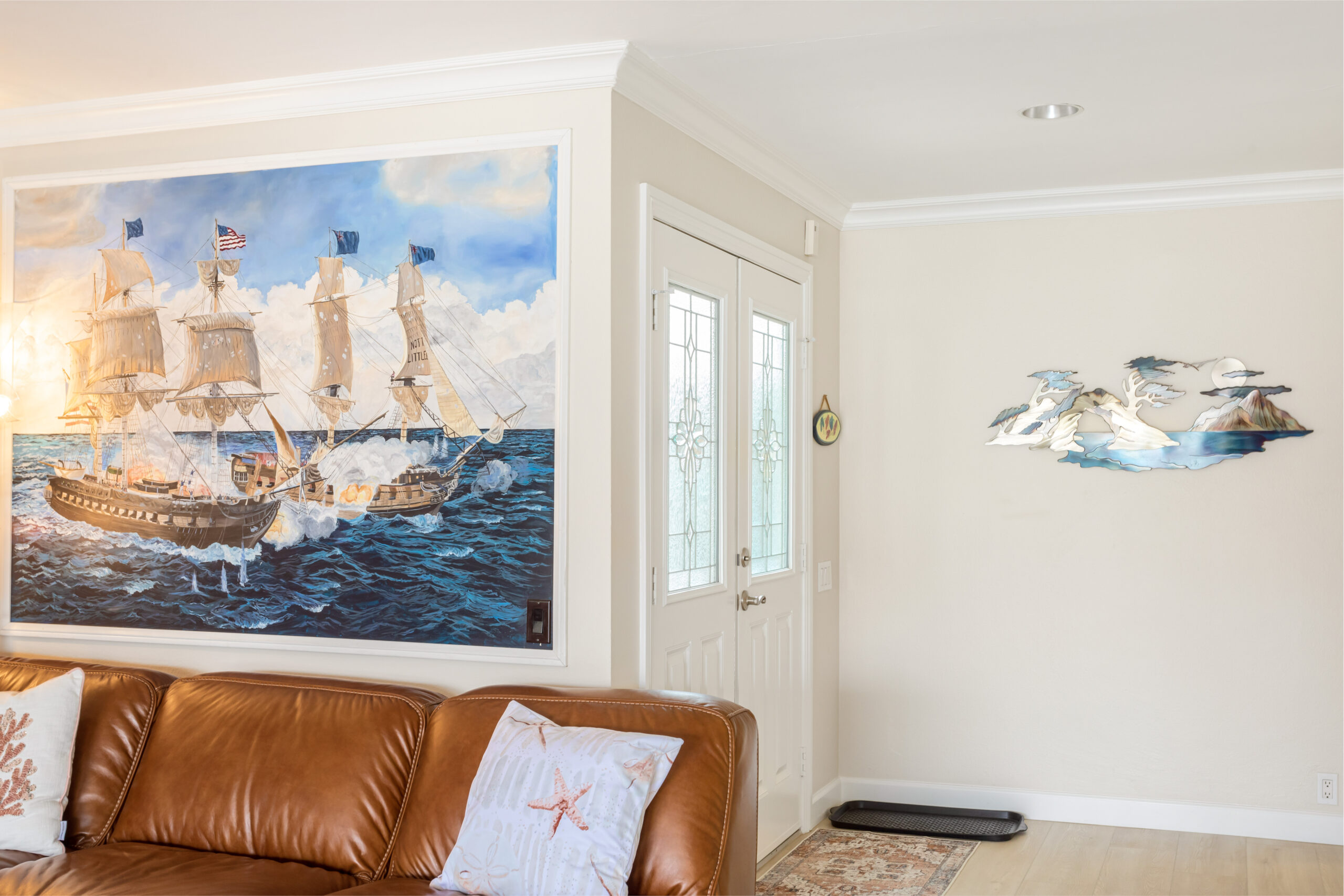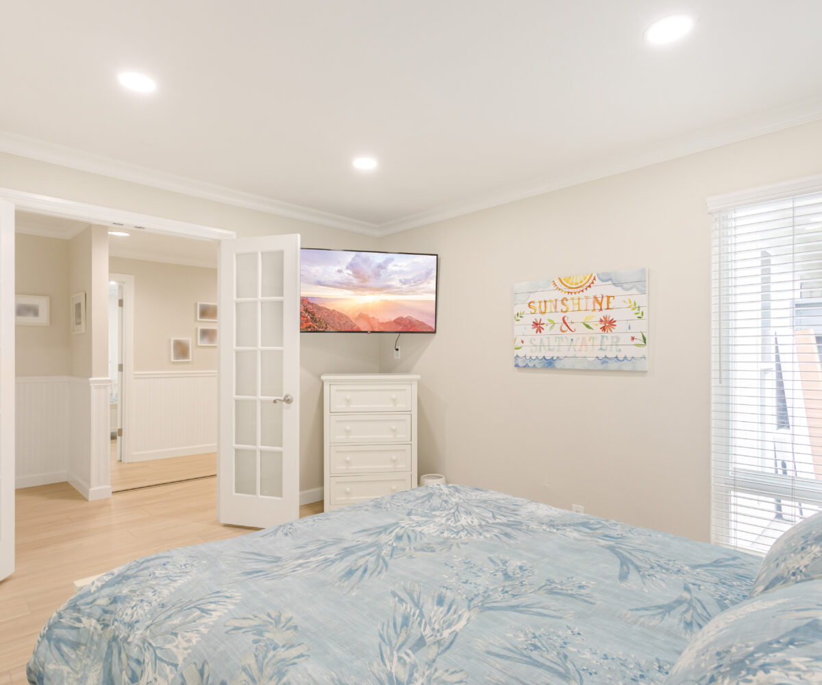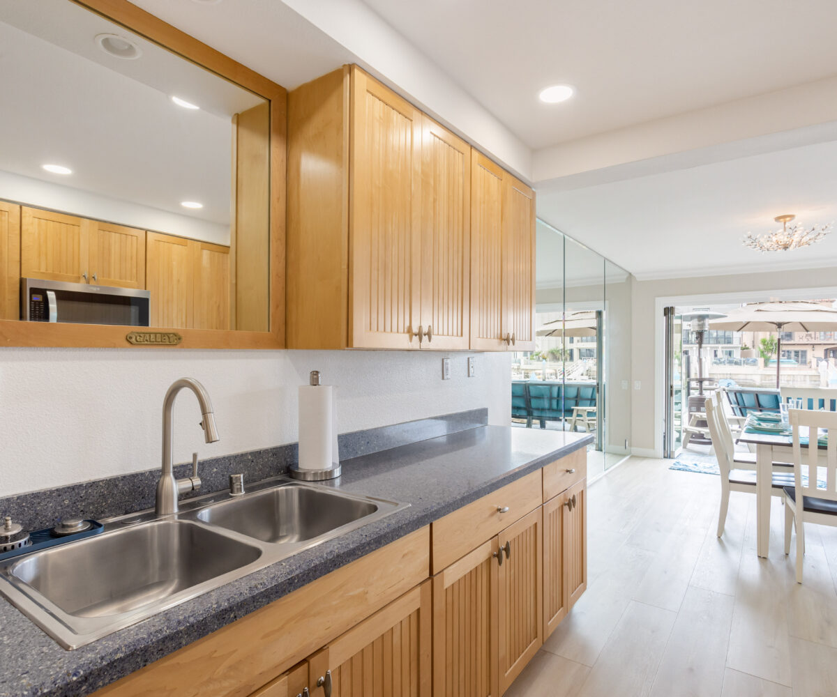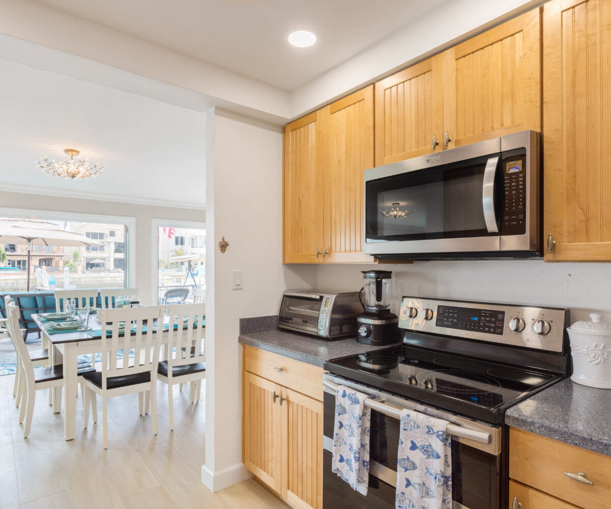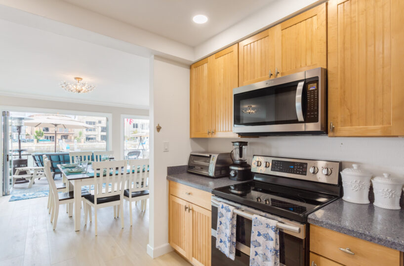 You can enjoy the boats entering and leaving the marina from the open California style kitchen. For eating in, the kitchen has everything you need. Von’s grocery store is only a 5 minute drive away and offer a wide variety of ready-to-heat-and-eat meals, gourmet salads, and adult beverages. Or barbecue on the outdoor patio with a stainless steel propane grill. Relax on the rocking chairs or lounge chairs to enjoy the waterfront view, gorgeous sunsets or fish from the back porch.