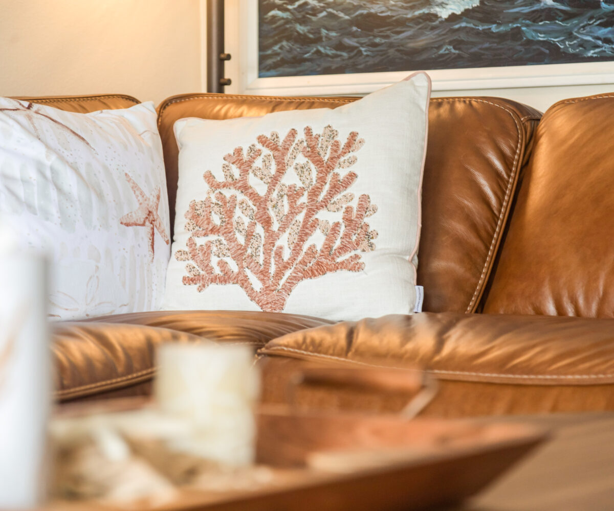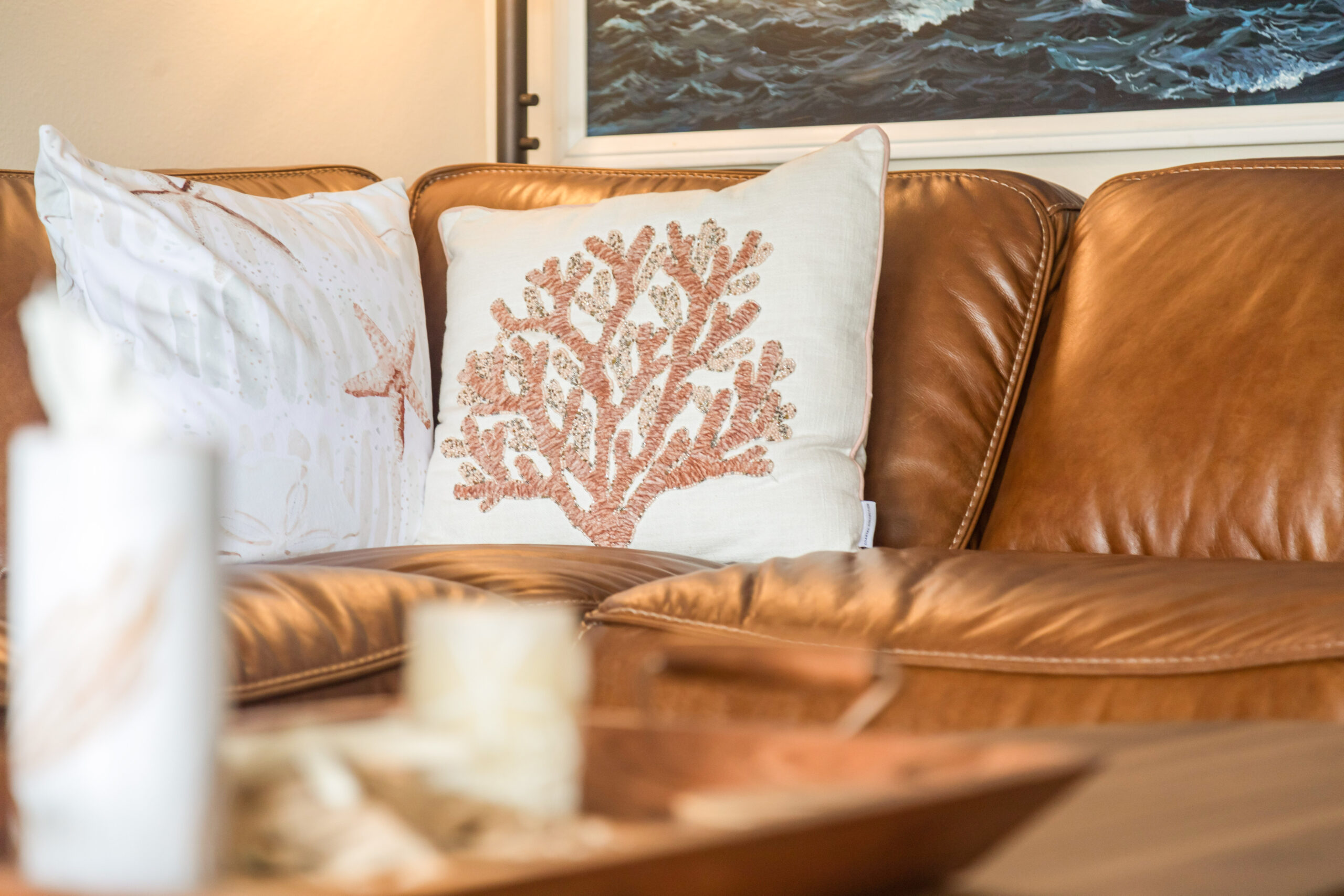 The dining room table sits 8. The Master Bedroom has a Cal-King size bed, two full sized beds (sleeps 4) are in the second bedroom and a queen is in the third bedroom. The leather Modular Sectional in the Living Room is large enough for the whole family.