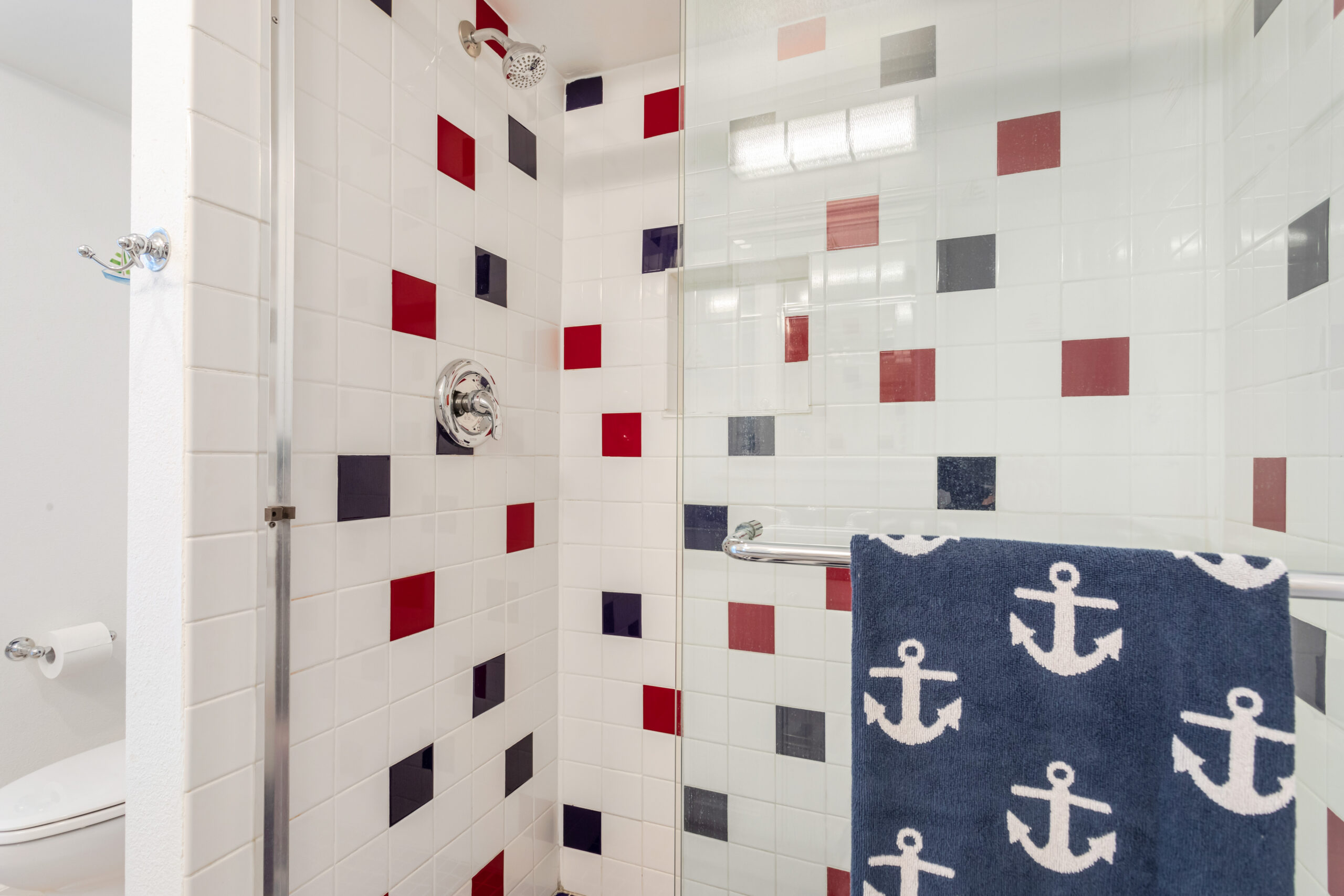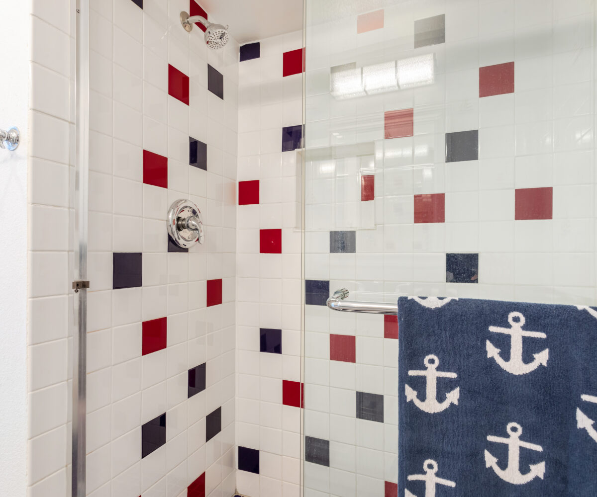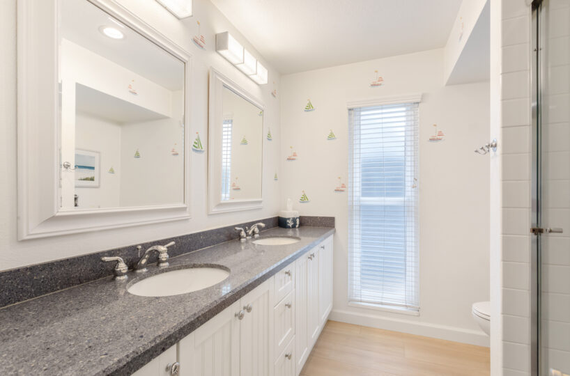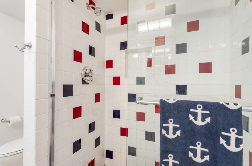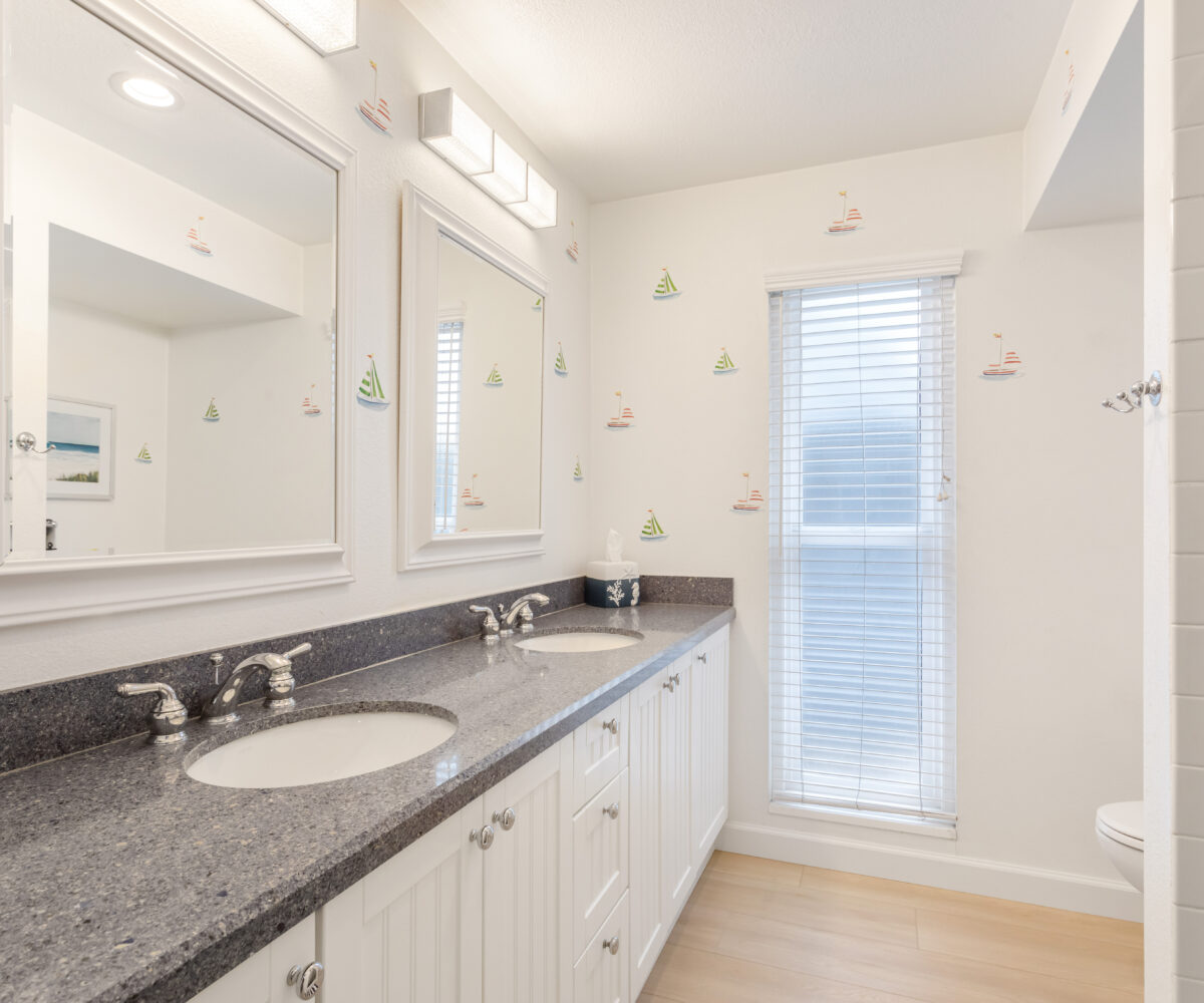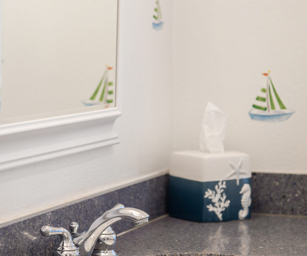 The Master Bedroom Bathroom has dual sinks and an extra large Marble tiled bath and shower area with a large oval soaking tub and extra large shower head. The Second Bathroom is tiled with a playful white, red and blue nautically themed tile and has an extra large shower and dual sinks. High quality cotton linens and fluffy towels are provided for your comfort. Beach towels, kid’s play toys, and life jackets are also included. Two kayaks available on the dock. An outside hot water shower is available in the enclosed side porch. A full sized laundry and washer are located next to the gaming cabinet filled with sporting equipment, board, dice and card games.