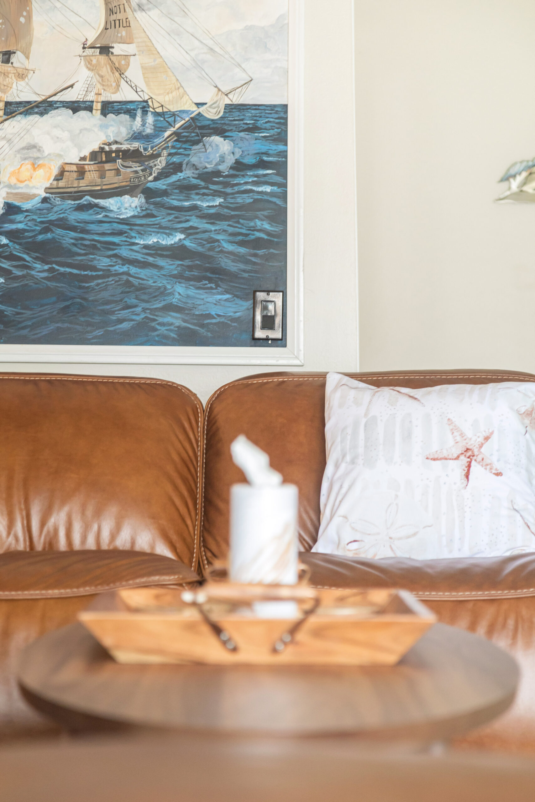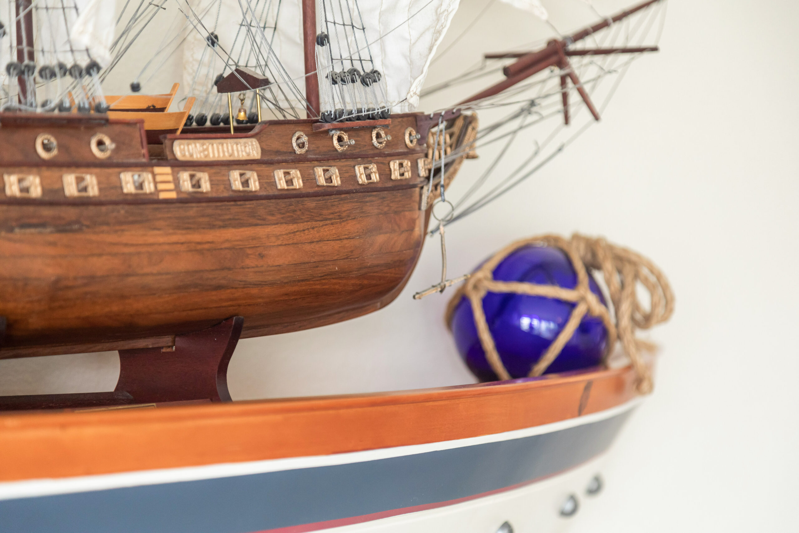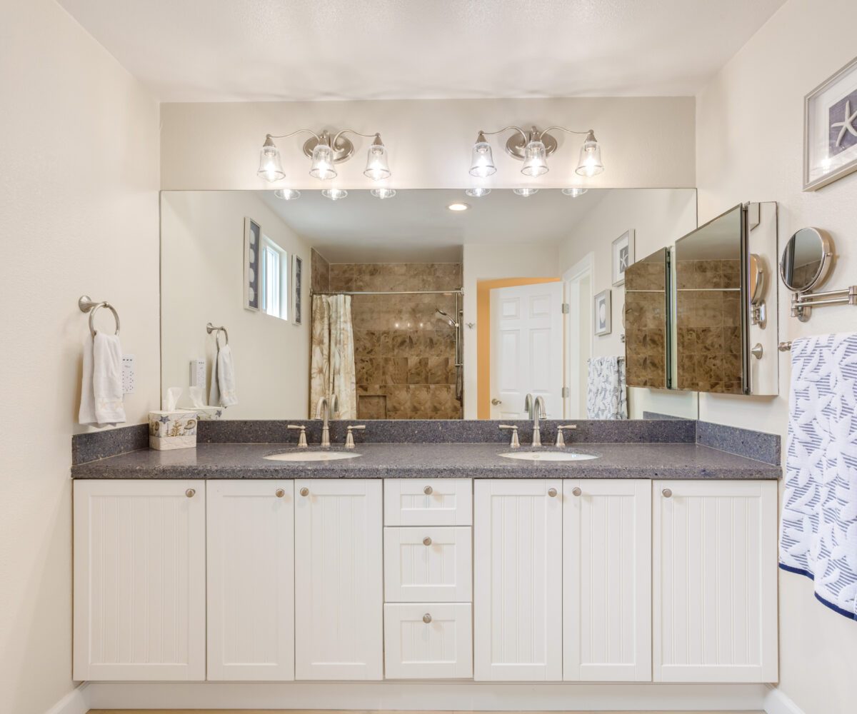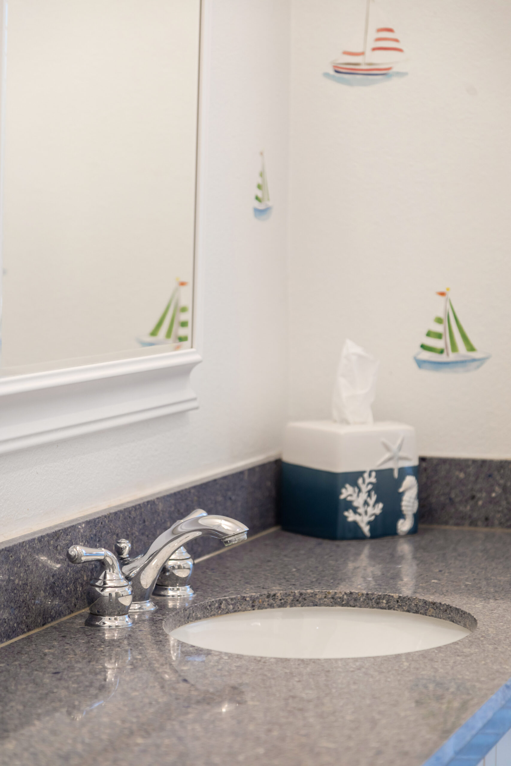 The Master Bedroom Bathroom has dual sinks and an extra large Marble tiled bath and shower area with a large oval soaking tub and extra large shower head. The Second Bathroom is tiled with a playful white, red and blue nautically themed tile and has an extra large shower and dual sinks. High quality cotton linens and fluffy towels are provided for your comfort. Beach towels, kid’s play toys, and life jackets are also included. Two kayaks available on the dock. An outside hot water shower is available in the enclosed side porch. A full sized laundry and washer are located next to the gaming cabinet filled with sporting equipment, board, dice and card games.